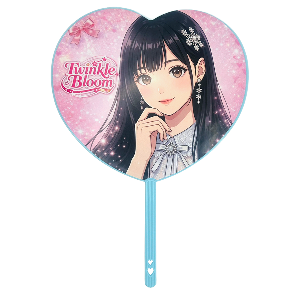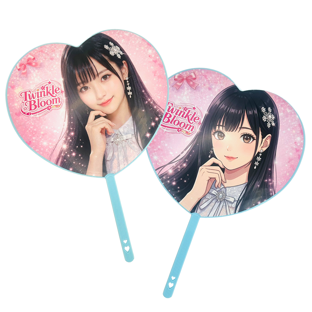 ハート型うちわは、見る人に直感的な親しみや好意を伝えやすいのが大きな特徴です。 アイドルやキャラクター、ブランドロゴとの相性も良く、 一般的な丸型うちわとはひと味違う特別感を演出できます。 配布物でありながら“応援アイテム”としても成立するため、受け取ったその場で使われやすく、 イベントの一体感づくりにもつながります。