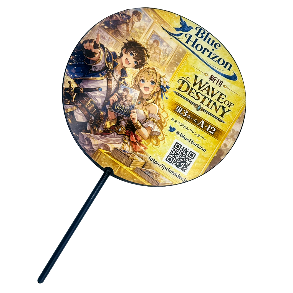 ライブ・コンサート・スポーツ応援・展示会・店舗配布・同人イベントなど、 柄付き丸うちわは幅広いシーンで活躍します。 「暑いから助かる」という実用性に加え、イベントの熱狂をそのまま自宅まで持ち帰ってもらえる “配って終わらない”ツールとして、高い販促効果を発揮します。